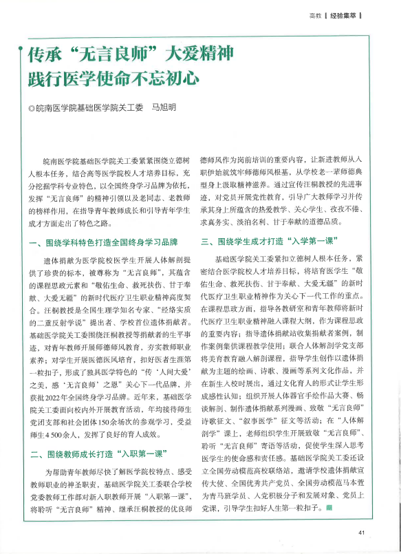 近日,由基础医学院党委书记、关工委主任马旭明撰写的《传承“无言良师”大爱精神 践行医学使命不忘初心》一文在教育部关心下一代工作委员会工作刊《心系下一代》上刊发。文章介绍了基础医学院关工委以全国终身学习品牌项目为依托,深度融合医学教育特色,弘扬“无言良师”奉献精神,在助推教师成长和学生成才方面取得的显著成效。