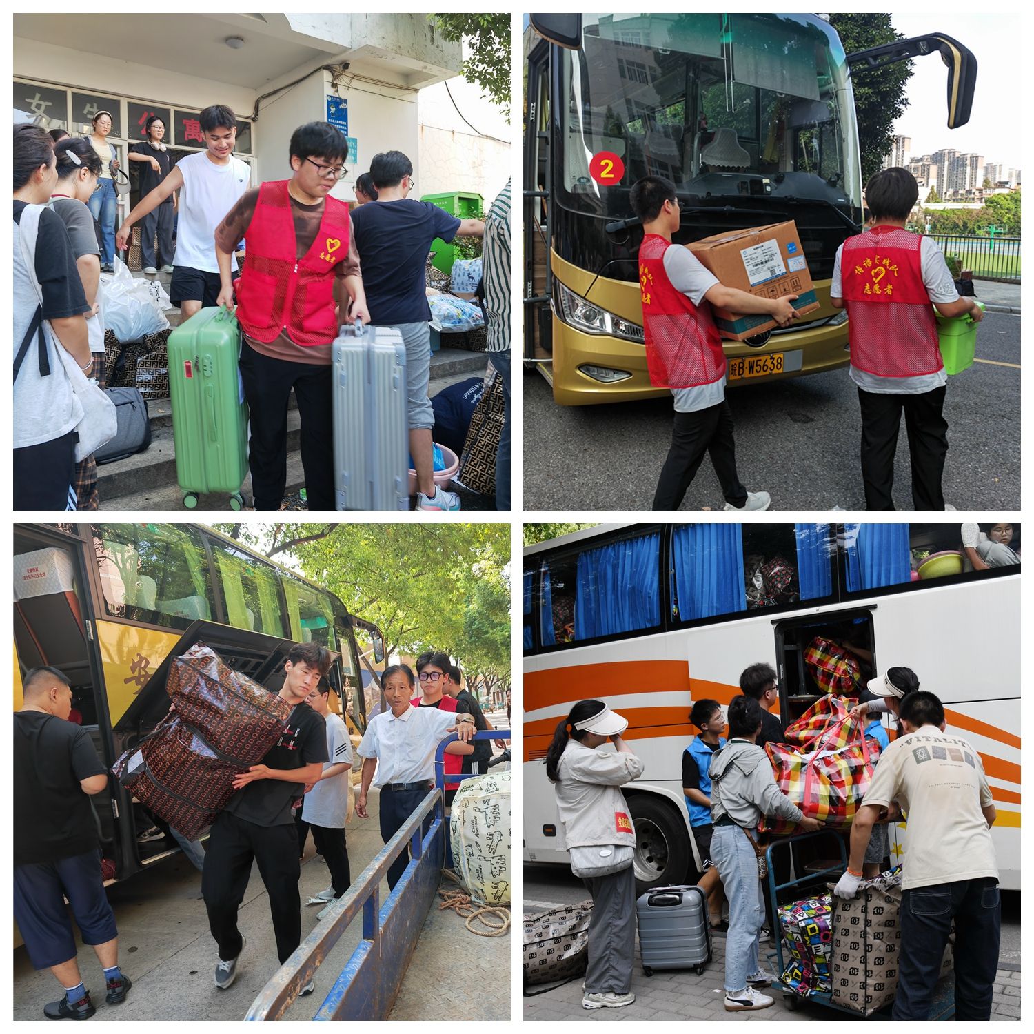 搬迁期间,学校组建了多支志愿服务队伍,包括由145名教工党员组成的党员志愿服务队、师生志愿服务队、后勤服务人员服务队等,与搬迁同学共同投入到校区搬迁工作中。虽烈日炎炎,但抵挡不住志愿者炽热的心,现场到处是志愿者忙碌的身影。大家分工明确、挺膺担当,手提肩扛、齐心协力,一次又一次穿梭于行李与车辆之间,一次又一次往返奔波于各楼层,即使汗水浸湿了衣衫却丝毫没有怨言。师生党员统一佩戴党员徽章,亮出党员身份,以身作则投入到搬迁工作中,让党旗在搬迁一线高高飘扬,让党徽在搬迁一线闪闪发光……从晨曦到日暮,在室外近40度的高温酷暑下,无论是搬运行李、疏散道路,还是解答疑问、提供指引,志愿者们都以饱满的热情和周到的服务做好各项工作,他们用劳累指数换来搬迁同学的笑脸指数、幸福指数,他们的身影成为了搬迁现场一道亮丽的风景线。