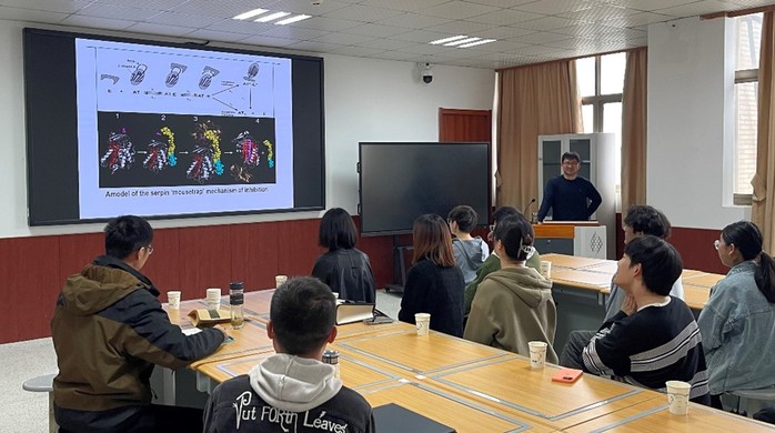 周路坦博士以“岩藻糖化糖胺聚糖衍生物在凝血和肿瘤转移中的研究进展”为题作学术报告。他结合经典药物研发案例和自身研究经历,详细介绍了岩藻糖化糖胺聚糖衍生物在抗凝抗血栓方面的药理活性和作用机制,分享了作为主要完成人参与“First-in-class 新药LFG53/ YB209”(获FDA和NMPA临床许可)项目的心得体会,介绍了岩藻糖化糖胺聚糖衍生物在肿瘤转移方面的研究进展和课题组目前所进行的部分研究工作。报告结束后,周路坦博士和与会师生进行了深入探讨。整场讲座内容丰富,生动有趣,给与会者留下了深刻印象。