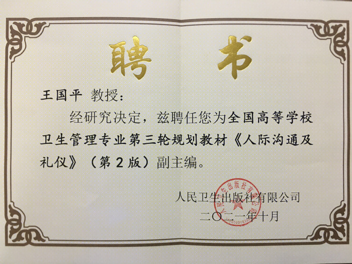 10月23日上午,大会隆重开幕,赵雪梅致欢迎辞。张亮、梁万年、朱双龙先后发表热情洋溢的讲话。大会提出第三轮教材编写将深入贯彻落实党的十九大报告中有关“健康中国”建设的战略目标,直面后疫情时代对卫生管理专业人才培养的全面反思,推动卫生管理专业教育教学改革,提高人才培养质量,加速推进医疗卫生服务从“以医疗为中心”向“以健康为中心”转变。大会宣布了全国高等学校卫生管理专业第三轮规划教材主编、副主编名单,并为教材主编、副主编代表颁发聘书。我校王国平教授被聘为全国高等学校卫生管理专业第三轮规划教材《人际沟通及礼仪》(第2版)副主编。
